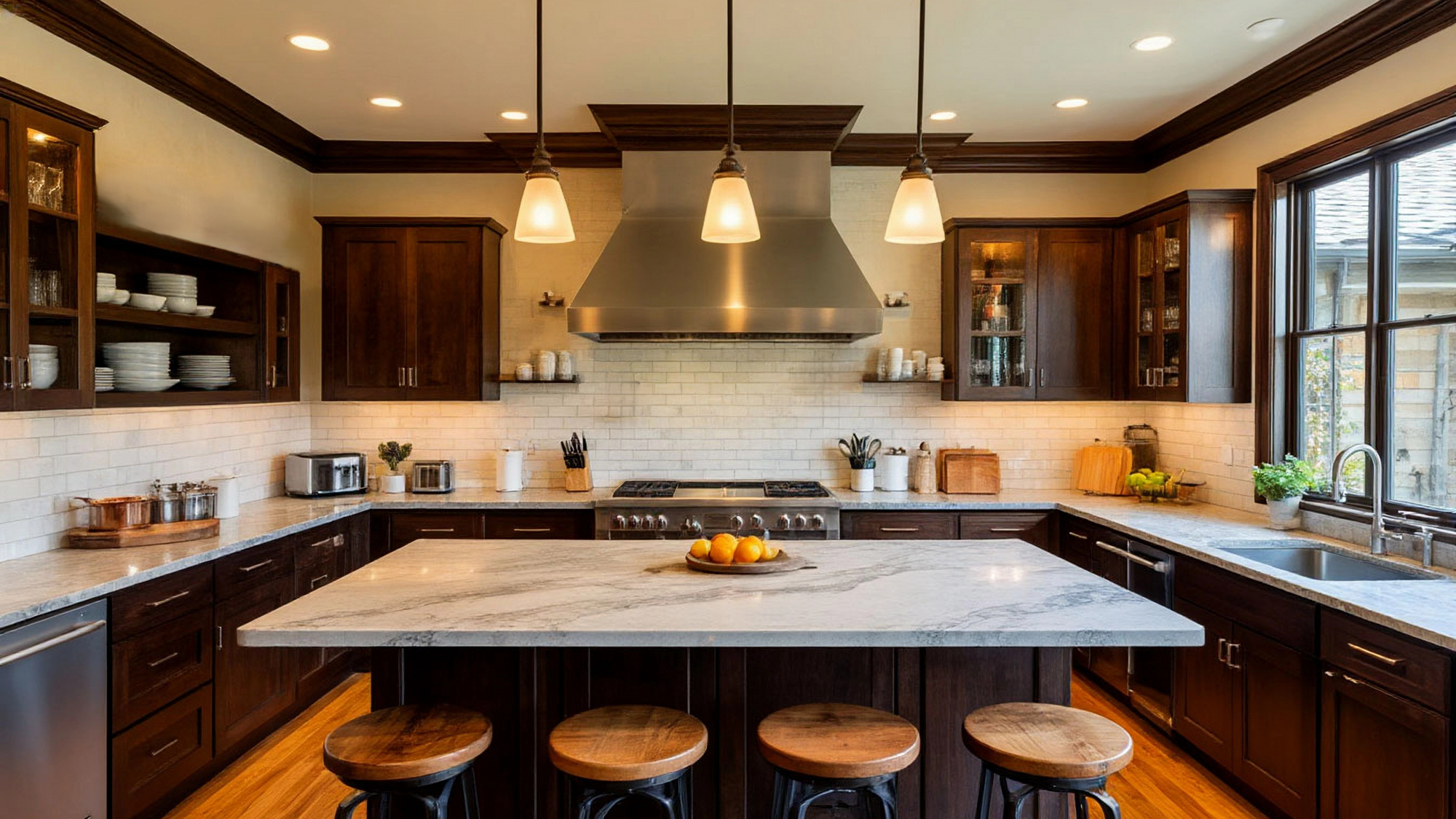 Особое внимание заслуживает материал фасадов. Тёмное дерево — это не только про эстетику, но и про атмосферу. Оно наполняет кухню характером, делая её по-настоящему основательной и солидной. Такая отделка ассоциируется с традициями, с мастерством, с чем-то фундаментальным, что не поддаётся времени. В то же время светлая каменная столешница разбавляет глубину древесного фасада, добавляет лёгкости и зрительной воздушности, создаёт баланс между массивностью и утончённостью. Этот союз даёт интерьеру ощущение завершённости и гармонии.