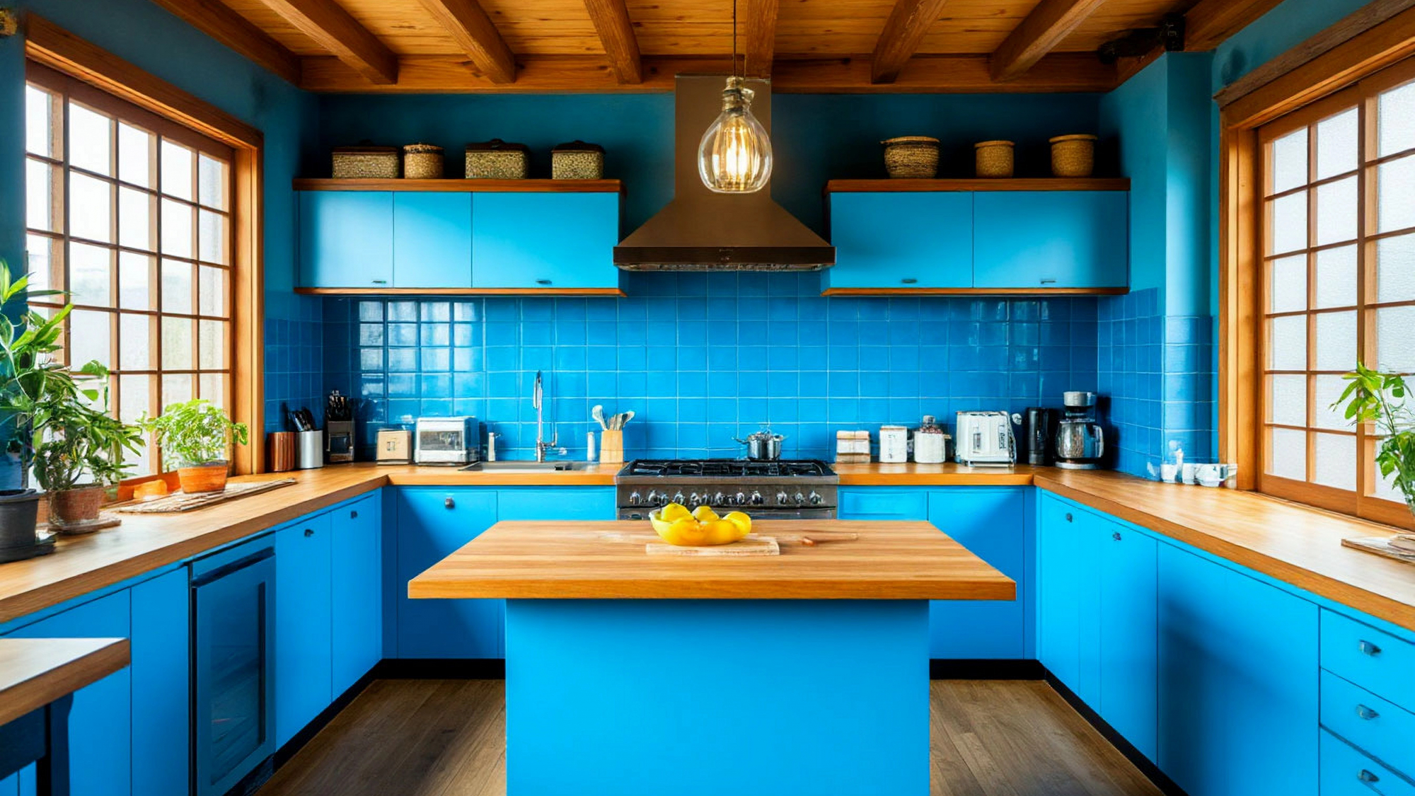 Голубой цвет в этой кухне — не просто декоративное решение, а важная часть эмоциональной атмосферы. Он успокаивает, структурирует пространство, делает его светлым даже в пасмурные дни. Это оттенок, который не давит, не утомляет, не перегружает визуально. Он создаёт ощущение воздуха, открытости, как будто в помещении стало больше света.