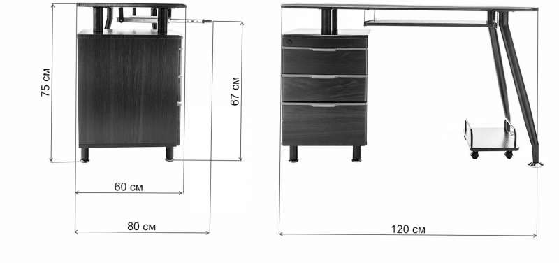 Высота до подставки: 65 см. Расстояние между ножками и тумбой: 67 см. Размер подставки под системный блок без учета ограничителей: 21х40 см. Габаритный размер подставки под системный блок: 24х40 см.